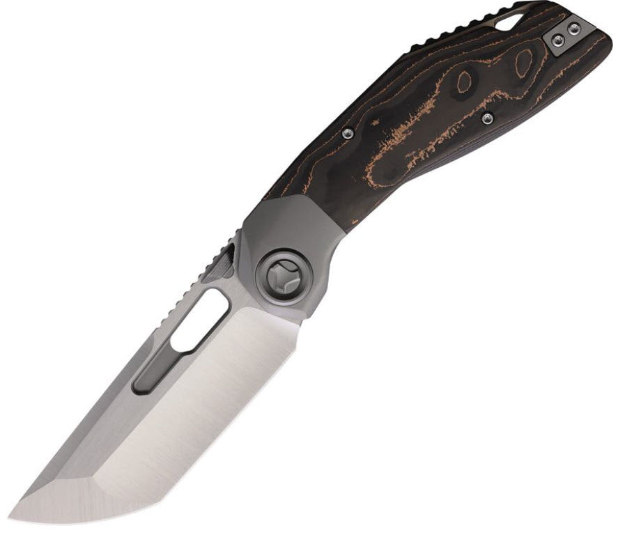 4.38" (11.13cm) closed. 3.38" (8.59cm) stonewash finish Bohler M390 stainless tanto blade. Gray titanium handle with Copper foil carbon fiber inlay. Thumb disk. Thumb pull. Lanyard hole. Pocket clip. Boxed.