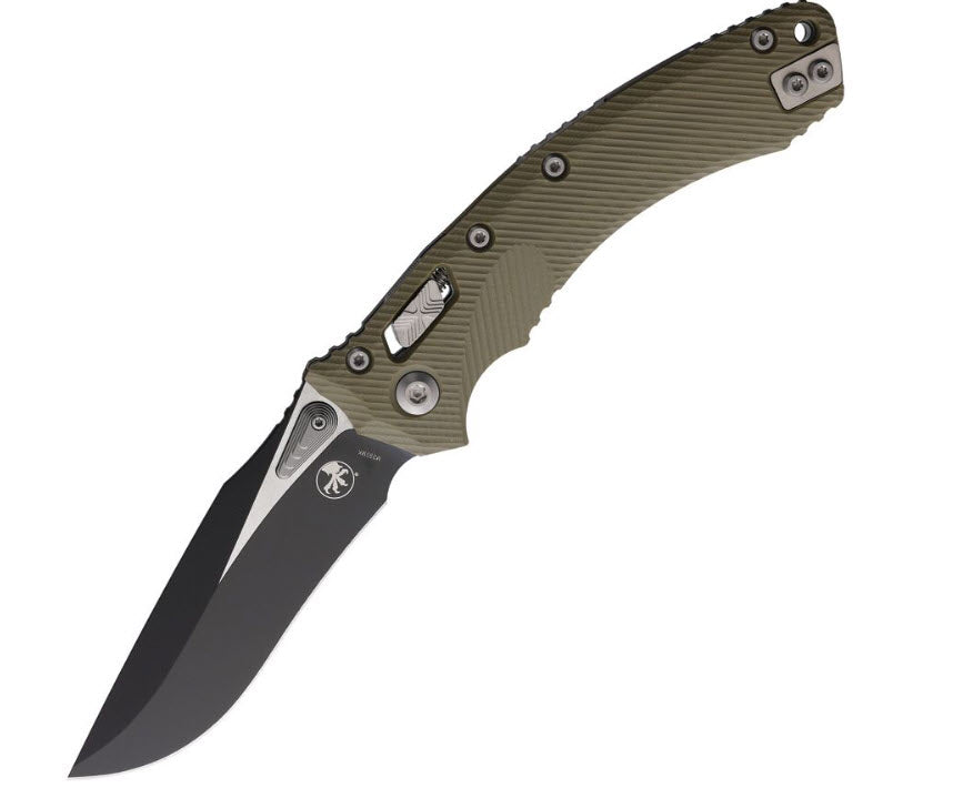 5.38" (13.67cm) closed. 4" (10.16cm) two-tone finish Bohler M390MK stainless blade. OD green G10 handle. Pocket clip. Lanyard hole. Unique thumb stud opener with ball bearing pivot. Microtech item #137RL-1FLGTOD. Boxed.